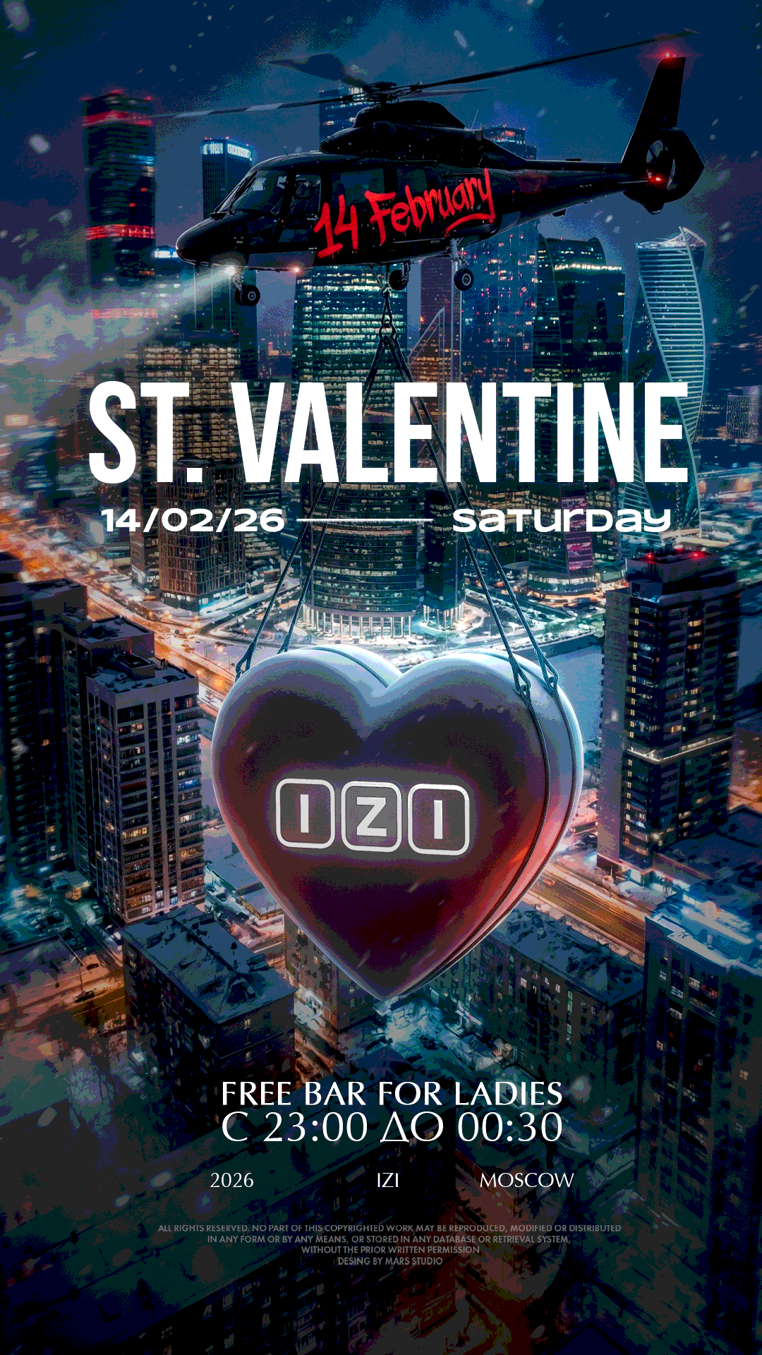 В ночь всех влюблённых IZI Moscow становится местом, где любовь парит над городом, а огни мегаполиса превращаются в декорации для самой красивой истории. Здесь пары приходят, чтобы остановить время, почувствовать тепло близости и вновь открыть друг друга, а город под ногами становится лишь фоном для их чувств. Коктейли зазвучат как признания, танцы — как диалоги без слов, а специальная арт-инсталляция превратит IZI в сказку, где каждый момент наполнится магией, нежностью и тем самым ощущением, когда весь мир будто создан только для двоих.